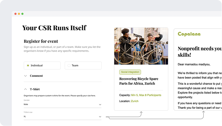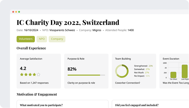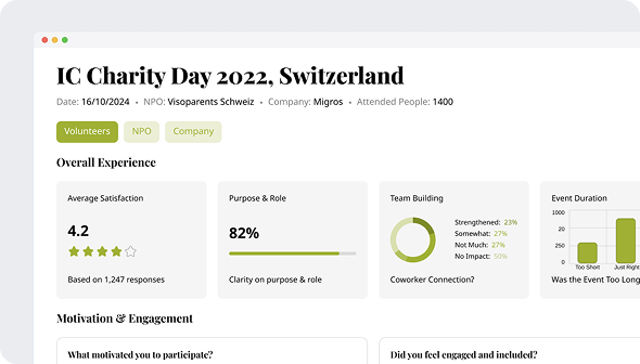 Unify your CSR activities in a single platform that makes participation easy, strengthens your community footprint, and gives you the structure to run high-quality programs across your Swiss organisation.