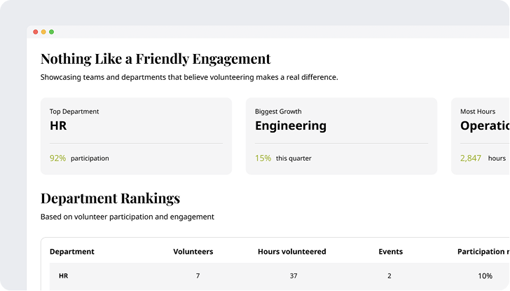 Build a structured foundation for your CSR activities. Centralize volunteering and fundraising opportunities, curate high-quality partners, and configure your program so it scales across departments and locations.
