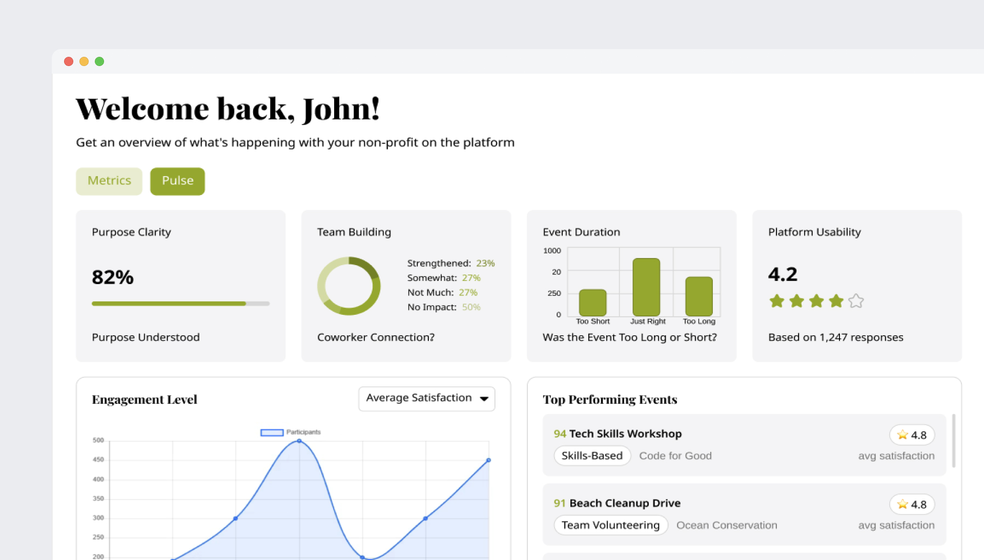 Pulse empowers companies, nonprofits, and volunteers with smart, authentic insights. From boosting engagement to improving collaboration, it turns feedback into actionable outcomes that create lasting impact.